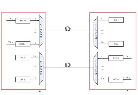 1) 在網(wǎng)絡(luò)的接入層,由于接入節(jié)點(diǎn)數(shù)量眾多,位置分散,速率相對(duì)不高,比較經(jīng)濟(jì)有效的解決方案是采用基于CWDM或DWDM技術(shù)的小型化波分方案。該方案采用開(kāi)放式、模塊化、可熱插拔的設(shè)備設(shè)計(jì)方式,集成可實(shí)現(xiàn)ITU規(guī)定的波分系統(tǒng)標(biāo)準(zhǔn)波長(zhǎng)轉(zhuǎn)換功能的光收發(fā)模塊,配備無(wú)源合波、解波器,可按照需求靈活配置最多16路的CWDM波長(zhǎng),以及最多48路的DWDM波長(zhǎng)信號(hào),并可實(shí)現(xiàn)單模多模信號(hào)之間的轉(zhuǎn)換。圖1為CWDM/DWDM小型化波分方案的示意圖。