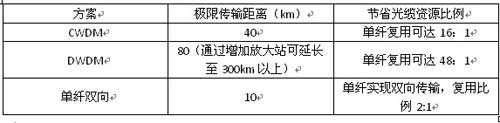 針對(duì)光纜資源緊張的現(xiàn)實(shí)問(wèn)題,光迅科技在平衡網(wǎng)絡(luò)傳輸需求與投資成本的前提下,設(shè)計(jì)的一系列解決方案,成本較低,開(kāi)通及維護(hù)方便,應(yīng)用靈活,可按需擴(kuò)容,對(duì)業(yè)務(wù)及速率透明,在傳輸需求復(fù)雜多變而光纜資源較少的接入層,被認(rèn)可為當(dāng)前極佳的解決方案并得到了廣泛應(yīng)用。表1對(duì)各種方案進(jìn)行了比較。