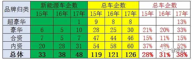 上表是按照品牌銷(xiāo)售的廠家口徑的數(shù)量,與合格證的廠家生產(chǎn)法人的口徑相對(duì)簡(jiǎn)化,但權(quán)威的仍是法人單位的統(tǒng)計(jì)角度。對(duì)18年實(shí)施雙積分的最初的預(yù)期是企業(yè)能迅速推動(dòng)插電混動(dòng)和純電動(dòng)的均衡發(fā)展,合資企業(yè)能夠推出新能源車(chē)。世界新能源車(chē)的隨著油價(jià)下跌的需求不旺,發(fā)展新能源車(chē)的熱情不高,新品推出不強(qiáng)。而合資企業(yè)的新能源車(chē)缺乏研發(fā)能力,外方導(dǎo)入需要一定時(shí)間,進(jìn)度相對(duì)較慢。因此17年的合資企業(yè)推出新能源車(chē)的有7家占比15%,內(nèi)資企業(yè)推出新能源車(chē)的有31家,占52%。